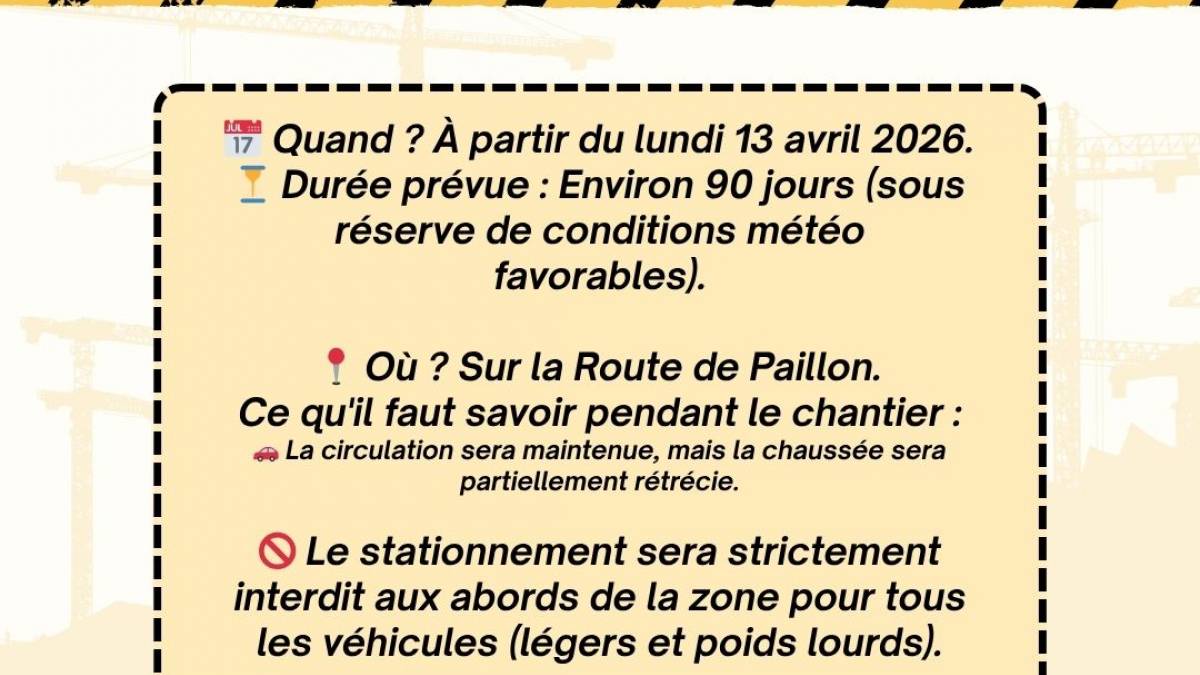 Information travaux Information travaux Publié le 03 avril 2026 / Dernière modification le 03 avril 2026 Information travaux Publié le 03/04/2026 - Dernière modification le 03/04/2026 Du lundi 13 avril 2026 à 08:00 au lundi 13 juillet 2026 à 12:00 🚧 AVIS DE TRAVAUX - Route de Paillon 🚧 ​La municipalité vous informe que des travaux de raccordement électrique (réseau ENEDIS) vont débuter prochainement dans notre commune. ​📅 Quand ? À partir du lundi 13 avril 2026. ⏳ Durée prévue : Environ 90 jours (sous réserve de conditions météo favorables). 📍 Où ? Sur la Route de Paillon. ​Ce qu'il faut savoir pendant le chantier : ​🚗 La circulation sera maintenue, mais la chaussée sera partiellement rétrécie. ​🚫 Le stationnement sera strictement interdit aux abords de la zone pour tous les véhicules (légers et poids lourds). ​⚠️ Merci de respecter la signalisation temporaire pour la sécurité de tous et des ouvriers. ​Nous nous excusons pour la gêne occasionnée et vous remercions de votre compréhension.