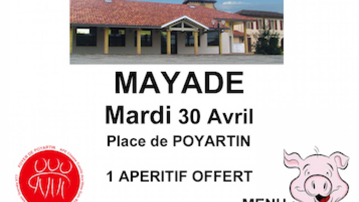 Mayade 2024 Mayade 2024 Publié le 05 avril 2024 / Dernière modification le 05 avril 2024 Mayade 2024 Publié le 05/04/2024 - Dernière modification le 05/04/2024 La traditionnelle mayade aura lieu le mardi 30 avril à partir de 19h sur la place. Au menu cochon de lait grillé frites. Nous vous espérons nombreux!