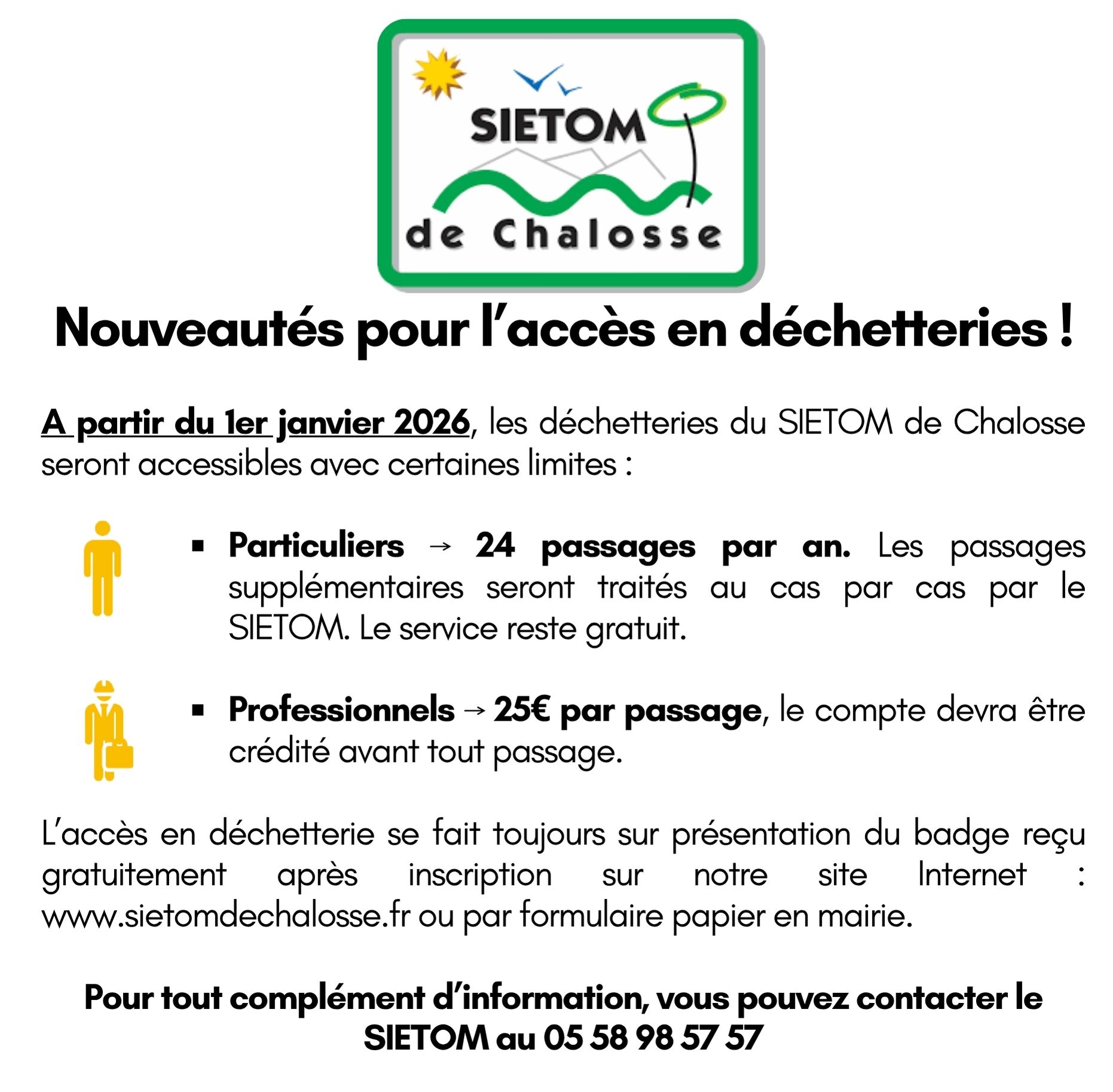 Les ordures ménagères doivent être déposées dans les containers des différents quartiers. Le ramassage est effectué par le SIETOM de Chalosse le lundi matin et le jeudi matin.